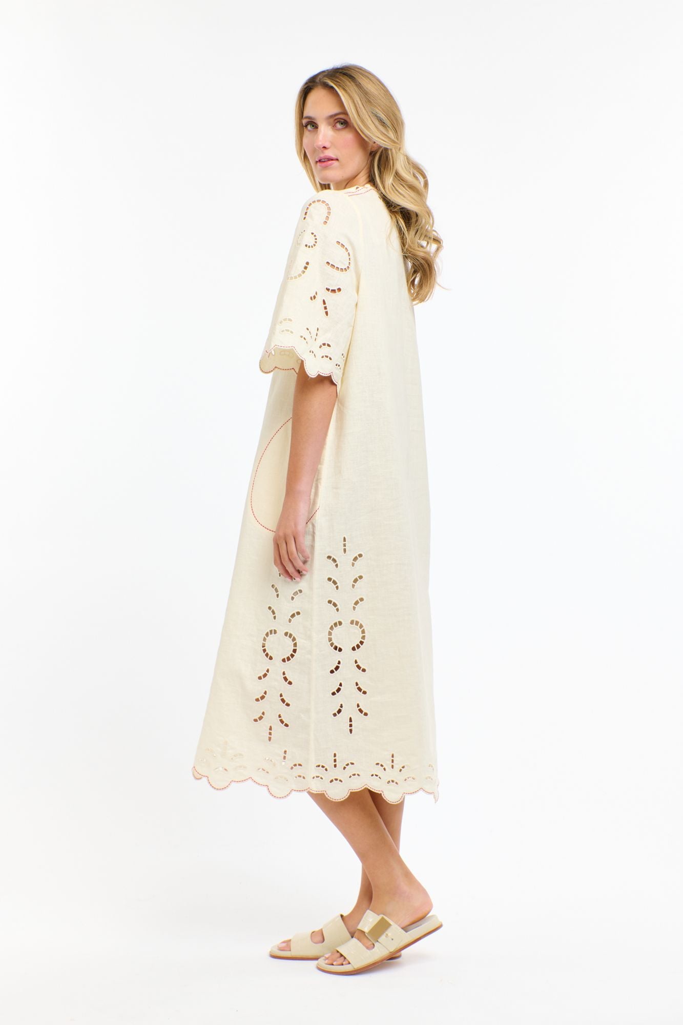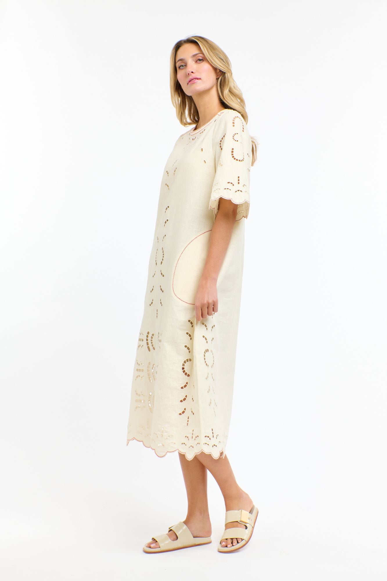 Bold broderie, beautiful ease. Annie Embroidered Dress’s all-over cutwork creates striking texture, balanced by a contrast-stitch round neckline and a relaxed, A-line silhouette. Elbow-length sleeves finish in scalloped edges that echo the hem for a graceful line. Slide on sandals for daytime, then add statement earrings to carry it into evening.