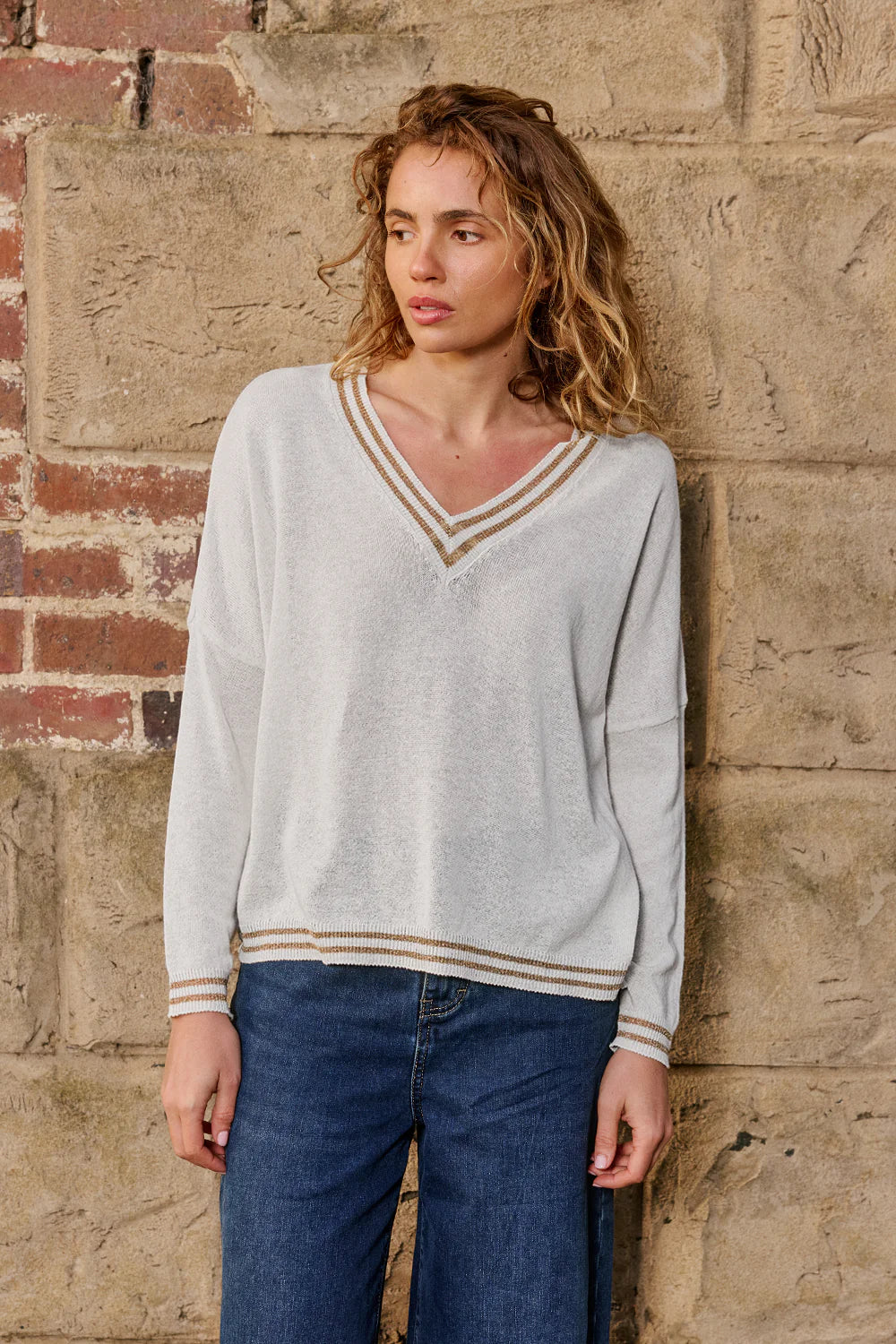 A soft 100% cotton knit pullover with a subtle lurex shimmer, adding a touch of sparkle to your wardrobe. The perfect transeasonal layering piece.