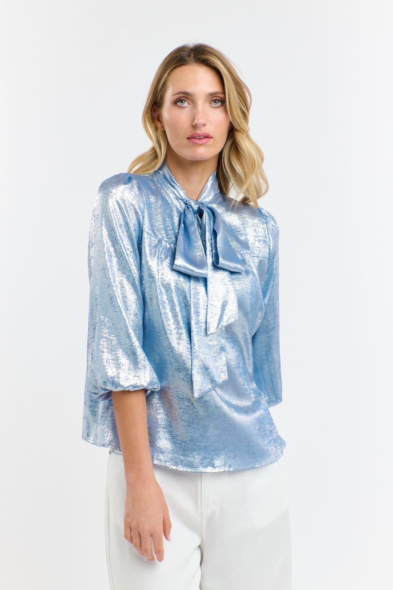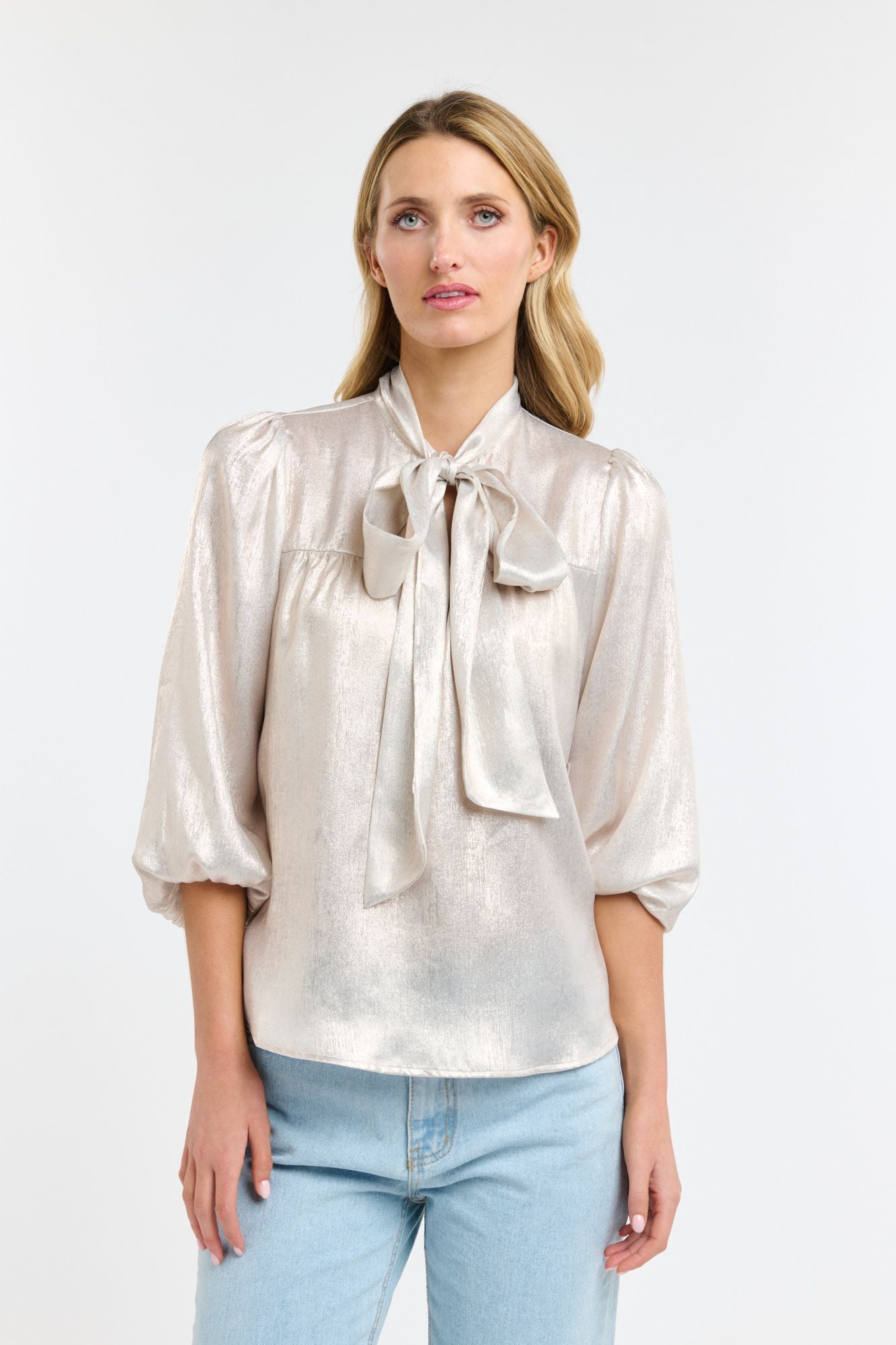 Elegant and stylish, the Pussy Bow Top is designed to stand out with its subtle lustre and soft drape. This summer version features 3/4 sleeves for a lighter, more relaxed feel, while retaining the timeless self-tie neckline and softly gathered details. Pair with denim, fluid pants or a tailored skirt for a look that goes from dinner to event dressing without missing a beat.